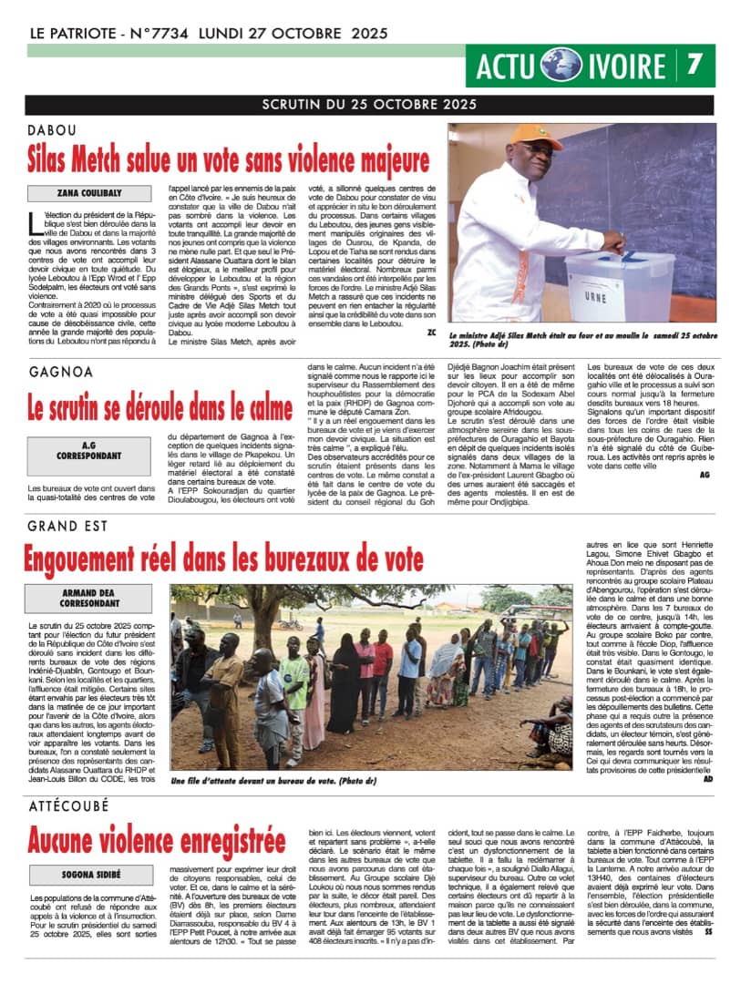 L’élection du Président de la République s’est bien déroulée à Dabou ville et dans la majorité des villages sans heurts. Les votants que nous avions rencontrés dans 3 centres de vote ont accompli leur devoir civique en toute quiétude. Du lycée Leboutou à Epp Wrod et Epp Sodelpalm, les électeurs ont voté sans violence. Contrairement à 2020 où le processus de vote a été quasi impossible pour cause de désobéissance civile, cette année la grande majorité des populations du Leboutou n’ont pas répondu à l’appel lancé par les ennemis de la paix en Côte d’Ivoire. « Je suis heureux de constater que la ville de Dabou n’ait pas sombré dans la violence. Les votants ont accompli leur devoir de vote en toute tranquilité. La grande majorité de nos jeunes ont compris que la violence ne mène nulle part. Et Que seul le Président Alassane Ouattara dont le bilan est élogieux, a le meilleur profil pour développer le Leboutou et la Région des Grands Ponts », s’est exprimé le Ministre délégué des Sports et du Cadre de Vie Adjé Silas Metch tout juste après avoir accompli son devoir civique au lycée moderne Leboutou à Dabou. Le ministre Silas Metch après avoir voté, a sillonné quelques centres de vote dans la ville de Dabou pour constater de visu et apprécier in situ le bon déroulement du processus. Dans certains villages du Leboutou, des jeunes gens visiblement manipulés originaires des villages de Ousrou, de Kpanda, de Lopou et de Tiaha se sont rendus dans certaines localités pour détruire le matériel électoral. Nombreux parmi ces vandales ont été interpellés par les Forces de l’ordre. Le Ministre Adjé Silas Metch a rassuré que ces incidents ne peuvent en rien étancher la régularité ainsi que la crédibilité du vote dans son ensemble dans Le Leboutou. Par Zana Coulibaly